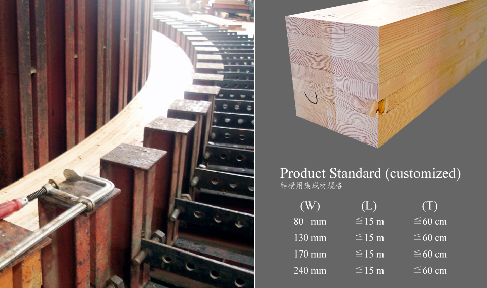 • 結構用集成材(Structural glued-laminated timber)其優點除了可有效使用短料以縱接方式延伸材料長度外,並可以層積方式增加材料斷面尺寸,因此可應用的範圍從裝修用材至大跨距結構用材皆可應需求製造。在世界各國已被應用於大型公共建築、橋樑、集合住宅與特殊設計的建築,凸顯出結構用集成材材料型式自由的特性。同時,結構用集成材具有分散缺點、品質均一、尺寸安定之特性,可解決大斷面製材品取得不易、強度品質不均及乾燥過程容易乾裂問題。